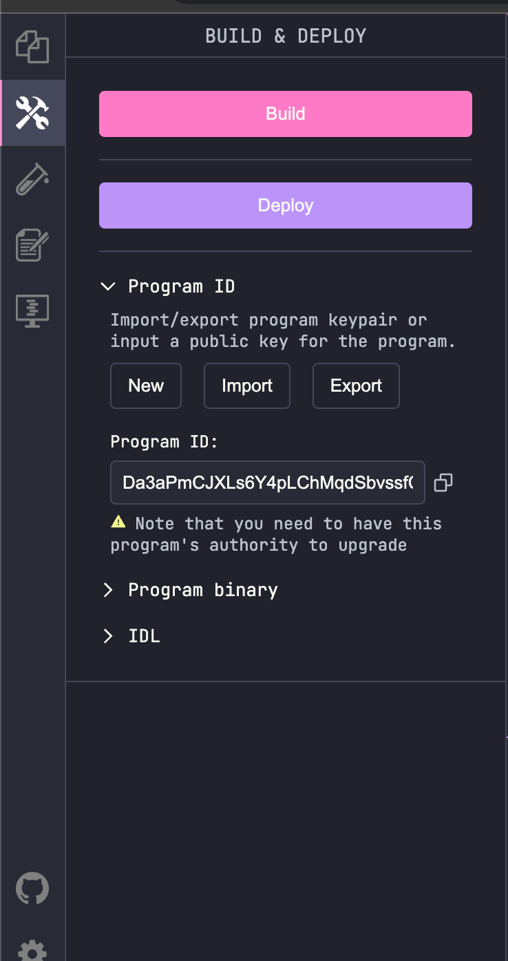 Now that you have some SOL in the address, we can deploy the contract using the build and deploy tabs on the left side of the playground as shown below.