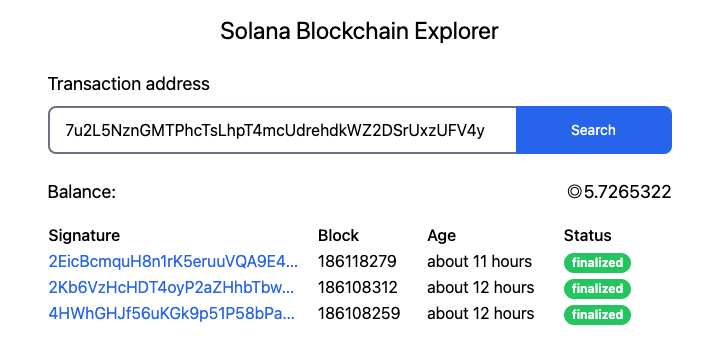 Save and reload your browser. You can now enter a Solana address and click the search button to fetch the transaction history. You should get a result similar to the screenshot below.