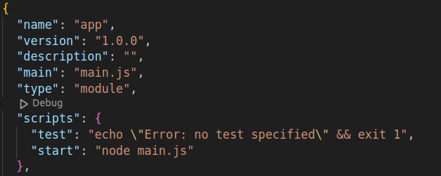 After installing the necessary dependencies, create a file main.js. Configure the project to ES6 by adding “type”:module and also write the start-up script for main.js by adding “start”: “node main.js” on package.json.