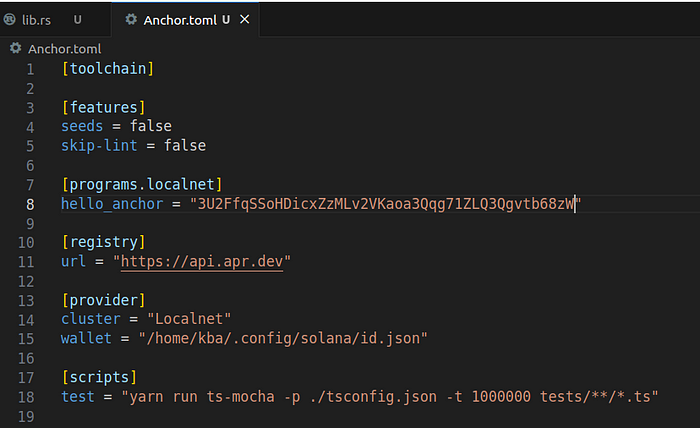 We also need to make changes on Anchor.toml file so that we can connect to Solana Localnet(The hello_anchor has to be filled with a place-holder, which will be replaced later).