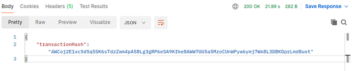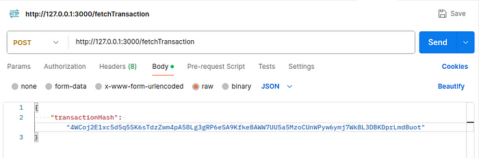 Now, we will test the second route for getting the transaction details, by invoking a Get method to fetchTransaction route by passing the transactionHash as input.